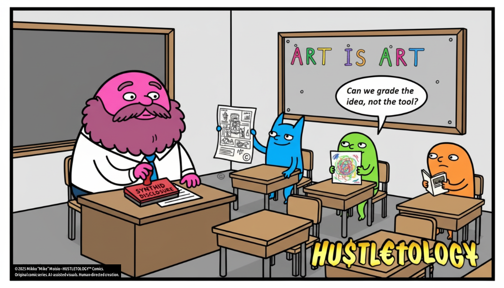 One kid holds up a comic they made with an AI image generator and some hand-drawn edits. “I picked the colors and wrote the joke,” they explain. The teacher stamps “SynthID” and moves on. Another kid holds up a crayon drawing of a dragon. Everyone claps. Nobody boos. Nobody accuses the dragon of cheating.