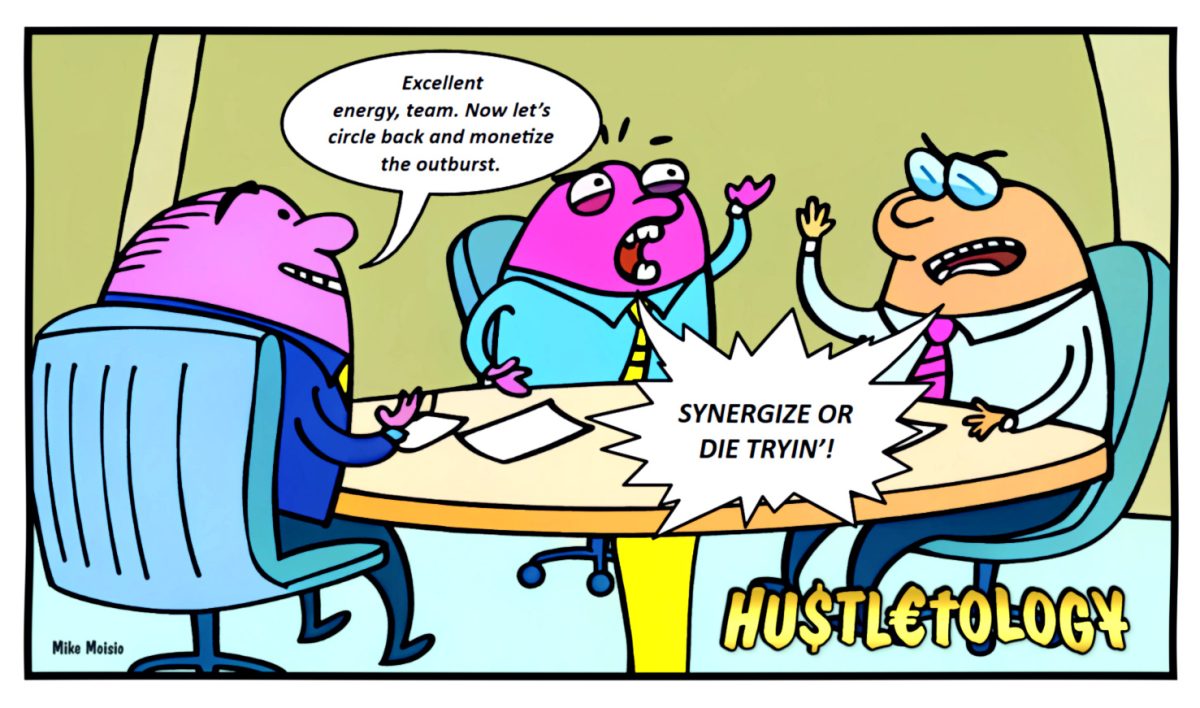 The weekly synergy summit was going as expected — until middle managers #7 and #8 slammed their fist on the table and yelled, “SYNERGIZE OR DIE TRYIN’!” No one knew what triggered them. Possibly the gluten-free croissants. Possibly the KPI report.