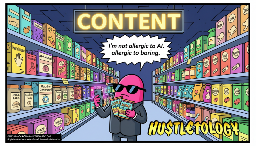 In the Content Aisle, everything comes with labels now. Not because society is terrified – because society is nosy. A shopper compares two joke packs: one says “Made by a human,” the other says “Made with AI assistance – SynthID embedded.”