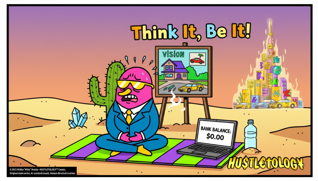 Today’s goal: manifest a million-dollar investment by lunchtime. He’s armed with nothing but positive affirmations, a vision board, and a YouTube playlist of “Wealth Frequency” tones humming in the background.